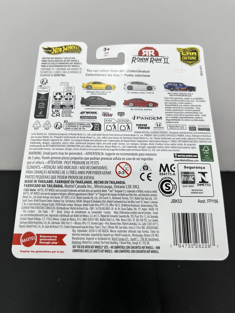 Hot Wheels 2025 Premium '07 Honda Civic Type R, part of the highly sought-after Ronin Run II series from Car Culture. This 1:64 scale diecast model features a sleek white finish, aggressive Type R styling, and premium detailing that JDM collectors crave.